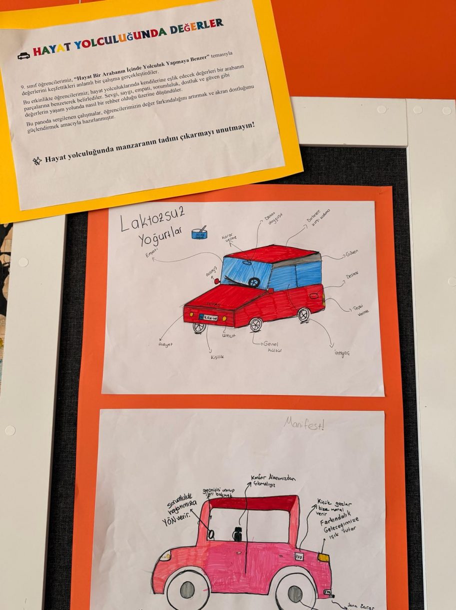 3 Mart Halil Güleç Fen Lisesi ve Ulviye - Ziya Gökalp Özer Anadolu Lisesi 9. sınıf öğrencileri, gerçekleştirilen "Değerler Arabası" etkinliğinde hayat yolculuğunda kendilerine rehberlik edecek değerleri farklı bir bakış açısıyla ele aldı. "Hayat bir arabanın içinde yolculuk yapmaya benzer" düşüncesinden yola çıkılan etkinlikte öğrenciler; sorumluluk, empati, nezaket, anlayış, iş birliği ve güven gibi temel değerleri bir arabanın parçalarıyla ilişkilendirerek değerlendirdi.